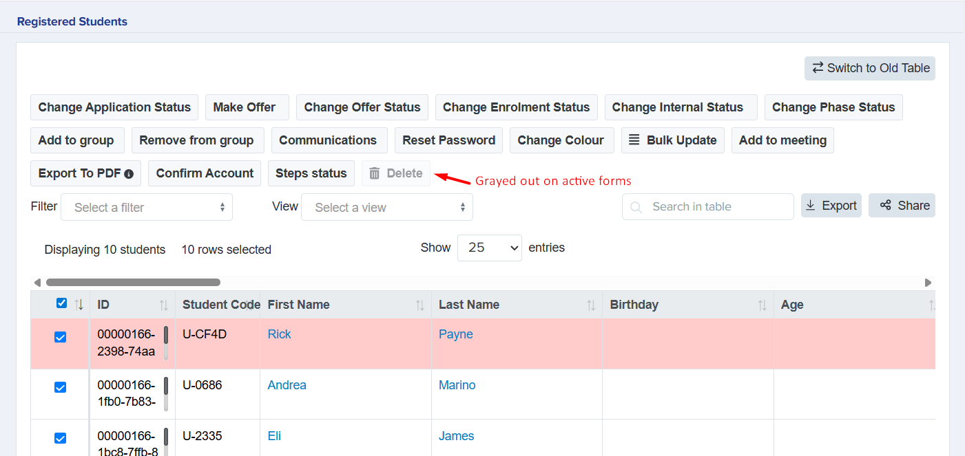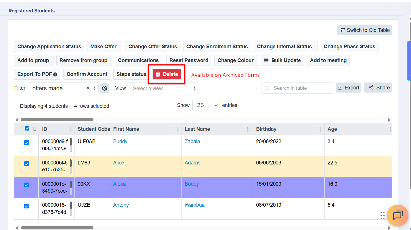 A delete button has been added to the student table, allowing users with Super Admin permissions to delete archived applications in bulk.