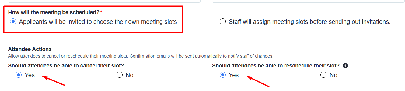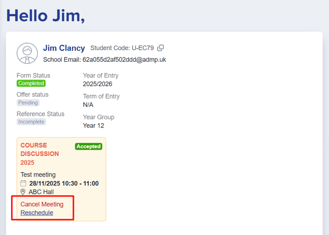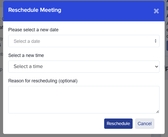 Students can now self-cancel or re-schedule their meetings and provide a reason for the change. Re-scheduling is only available when the meeting is configured to allow attendees to choose their own time slot.