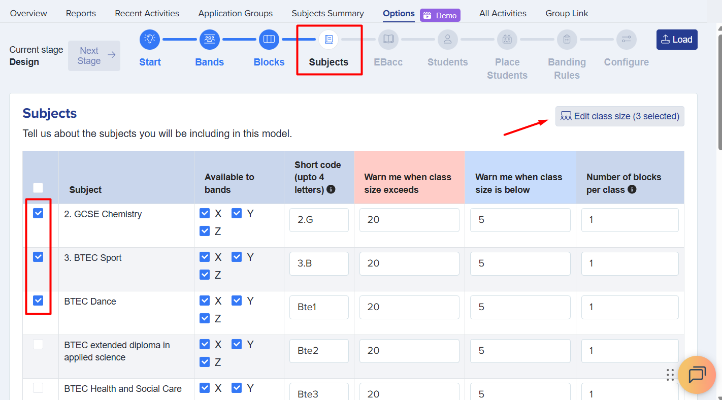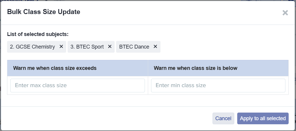 Class sizes can now be updated in bulk using the newly added ‘Edit class size’ button in the Options module. This enhancement saves time when adjusting multiple classes at once, ensuring that class sizes are accurate across the Options model without the need to edit each class individually.