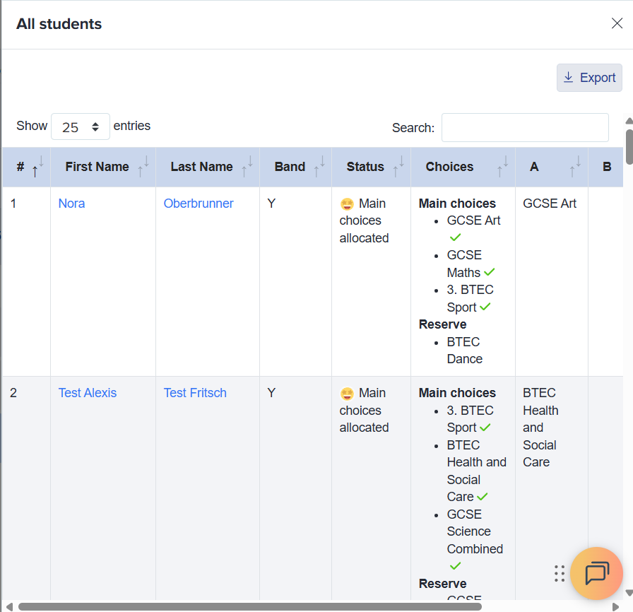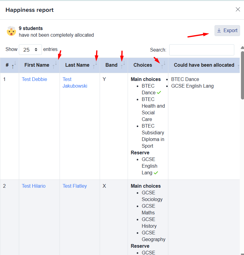 Statuses within the Options module can now be sorted and exported for easier review and tracking. Clicking the happiness report icon now opens a detailed list of students, where each column can be sorted using the up/down arrows.