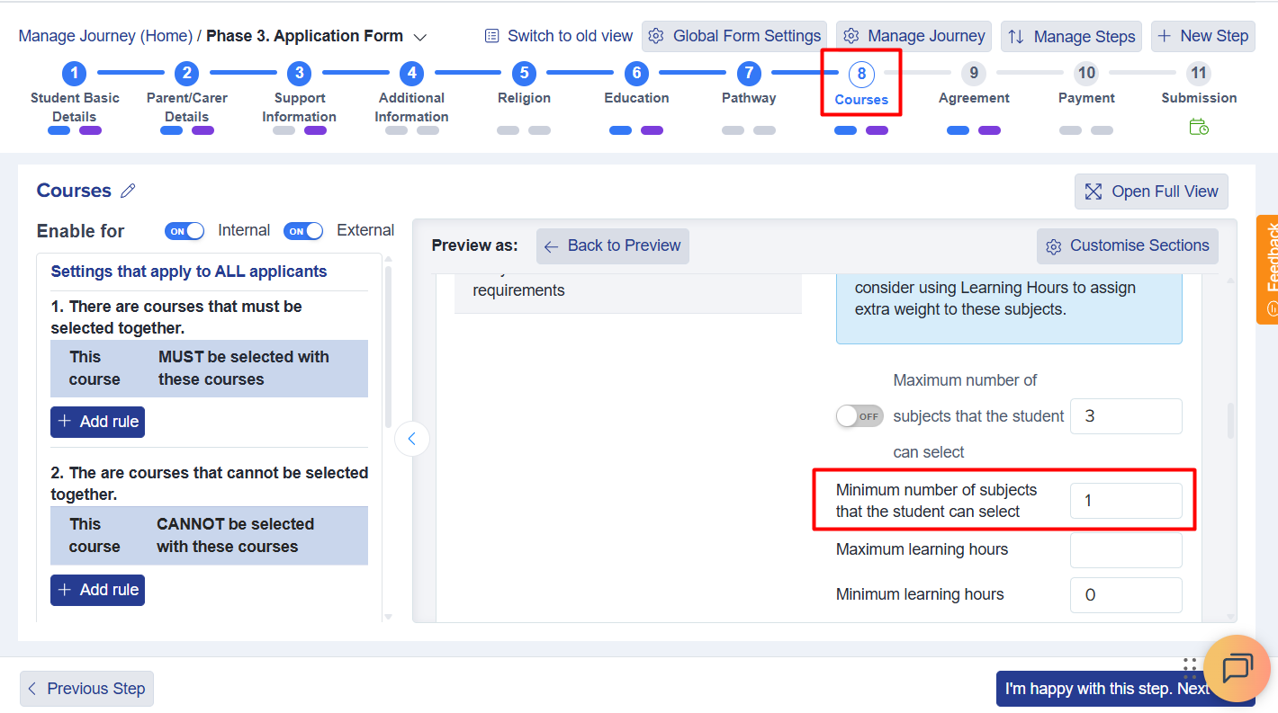 The minimum course selection is now set to 1 by default, preventing students from skipping the Courses step and avoiding potential validation errors. This ensures that all students select at least one course.