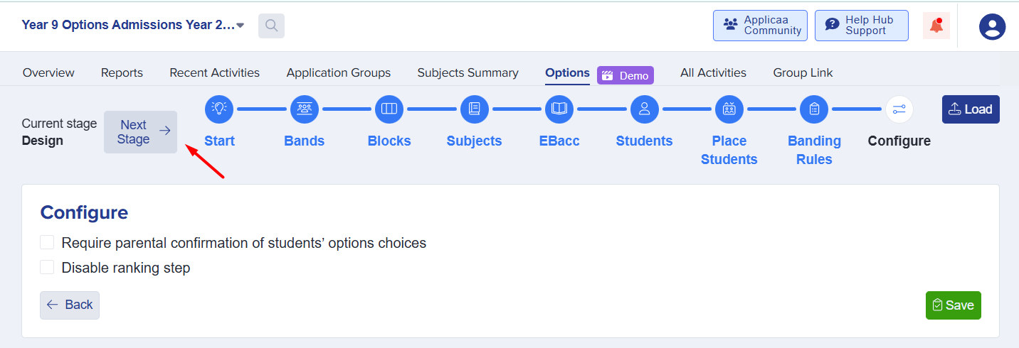 The arrow buttons that control progress within the Options module have been updated to better reflect their purpose, making it clear whether an action will publish changes or simply mark a step as done.