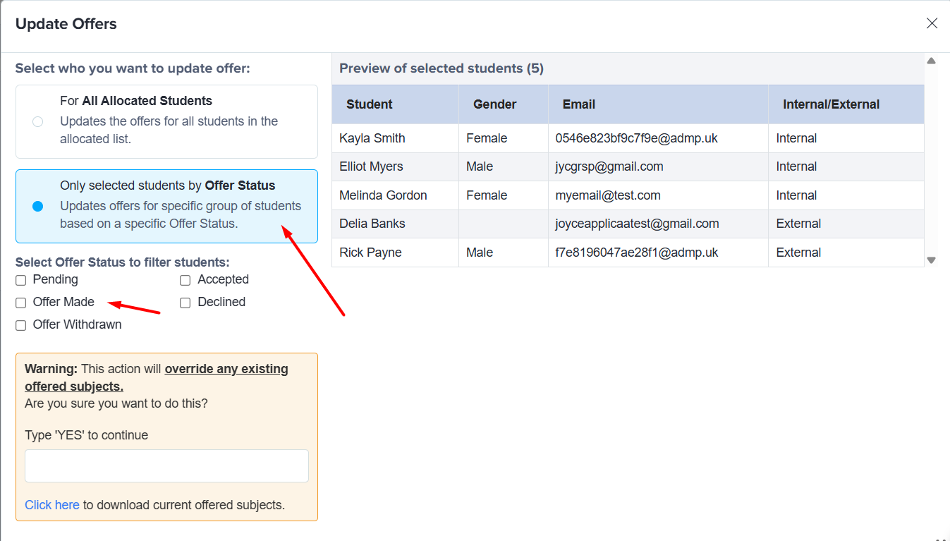 You can now filter students by ‘Made Offer’ in the Options module when updating offers. This allows you to update offers only for students who have already been made an offer, improving efficiency and ensuring changes are applied to the correct group of students.